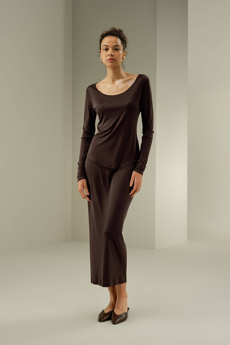 Ett mjukt, draperat stickat möter sidens flytande glans; en ensemble som fångar kvällsljuset.